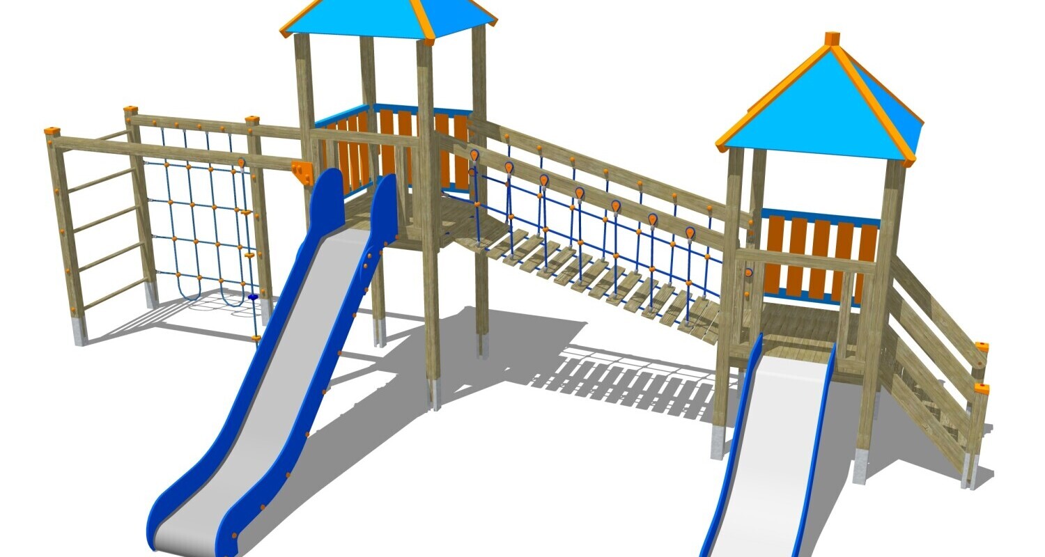 Zwei-Turmanlage Max xm208lppur mit Brücke und Turnanlage in Holzausführung: Duolam-Standpfosten, 9x9 cm; Spielböden 112x112 cm aus 33mm-Massivholz, Treppenaufgang H 84 cm mit rutschfesten Stufen, Zeltdächer und Brüstungen farbig aus Holz. Turnanlage mit Kletternetz, Schwedenleiter und Kletterseil. Flachrutschen H 84 cm und H 144 cm mit Edelstahlboden und Seitenwangen aus HPL-Laminat. Bodenanker zum Einbetonieren oder zum Aufdübeln. Schrauben feuerverzinkt mit Kunststoffschutzkappen.