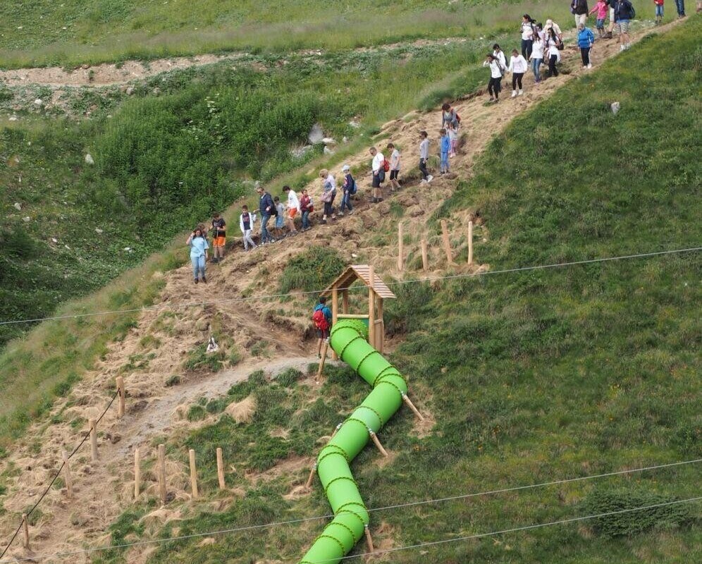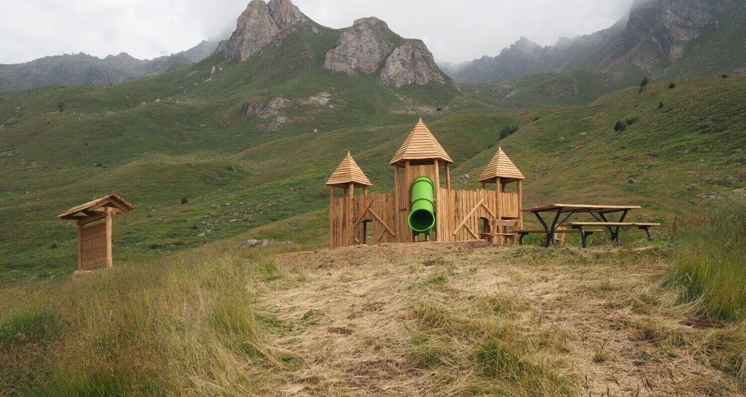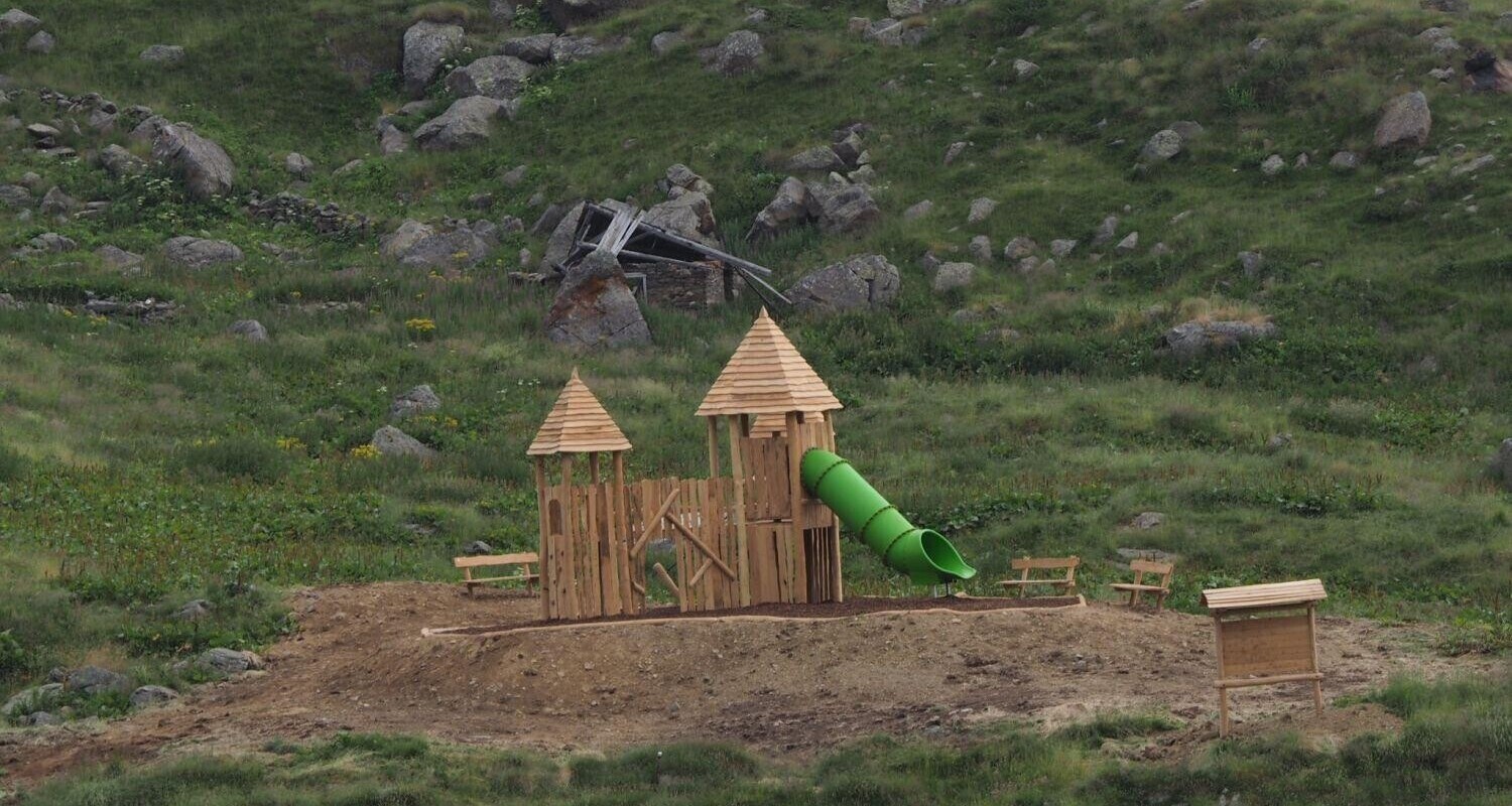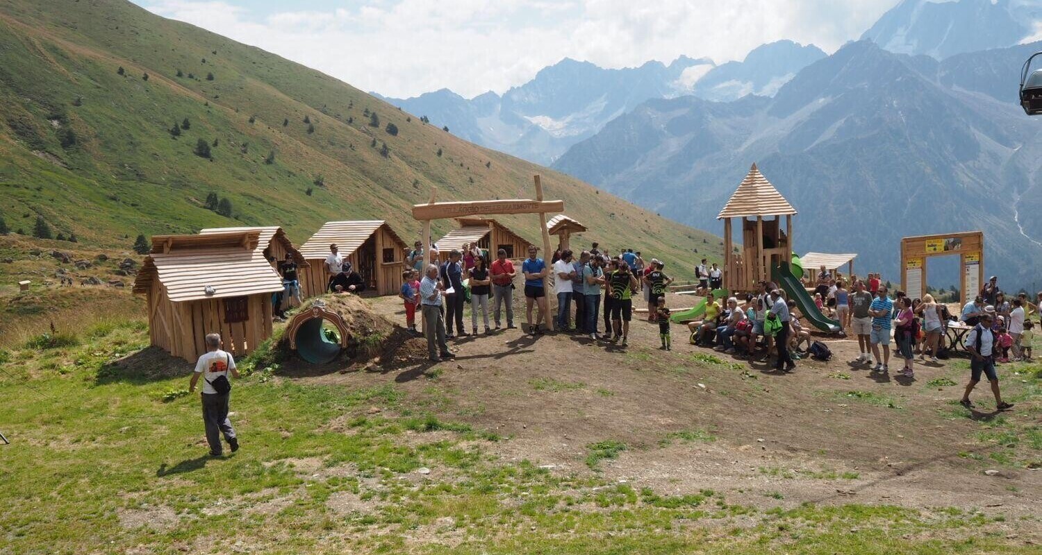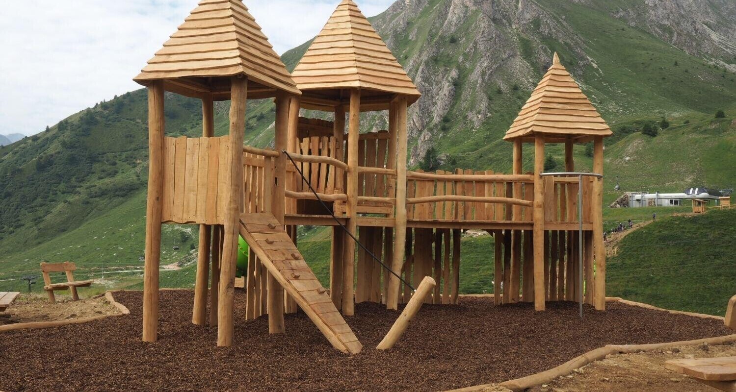 The highest playground ever installed by Holzhof, namely on 2200 meters above sea level, was inaugurated last Saturday. A stunning Holzhof-playground decorates since a few weeks the Passo Tonale (locality: Valbiolo) together with a recently opened “Bike Park” and the “Villaggio delle Marmotte” ( translated: marmot village) and is a real eyecatcher. Playing towers, tot houses, water mills, climbing frames as well as benches made of black locust (Robinia Pseudoacacia) and tube slides made of recyclable polyethylene, offer a lot of fun for children. The Holzhof- playground is surrounded by a breathtaking environment with view to the Adamello- Presanella Alps and the black locust wood emphasizes the alpine ambience.