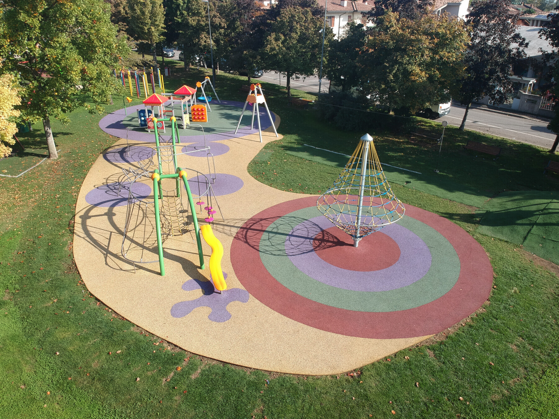 Grazie alla possibilità di mixare colori ed effetti la pavimentazione può diventare di per sé un gioco allegro e divertente, oppure segnalare aree del parco attrezzate per utilizzi differenti, come ad esempio una separazione tra spazio ludico e spazio sportivo.