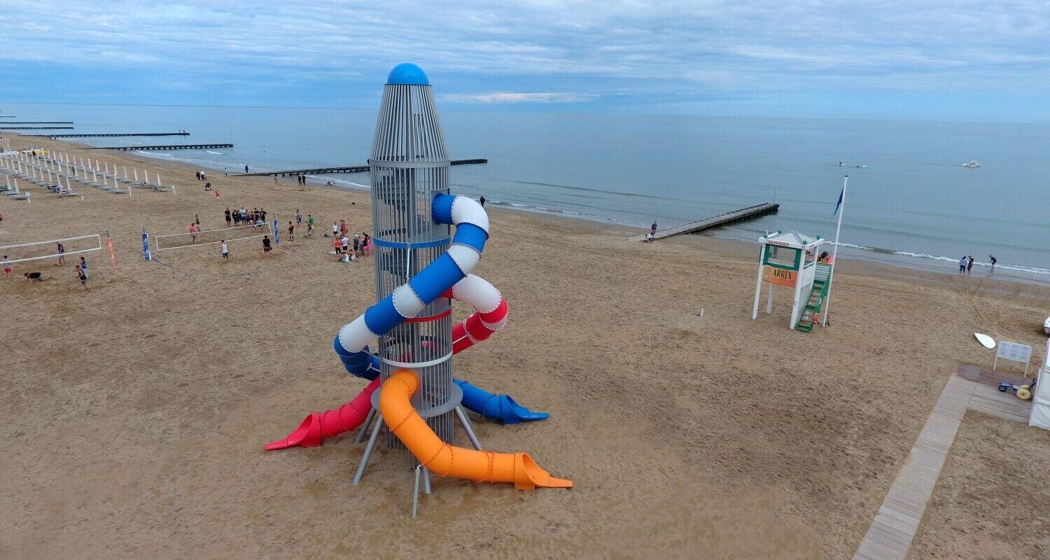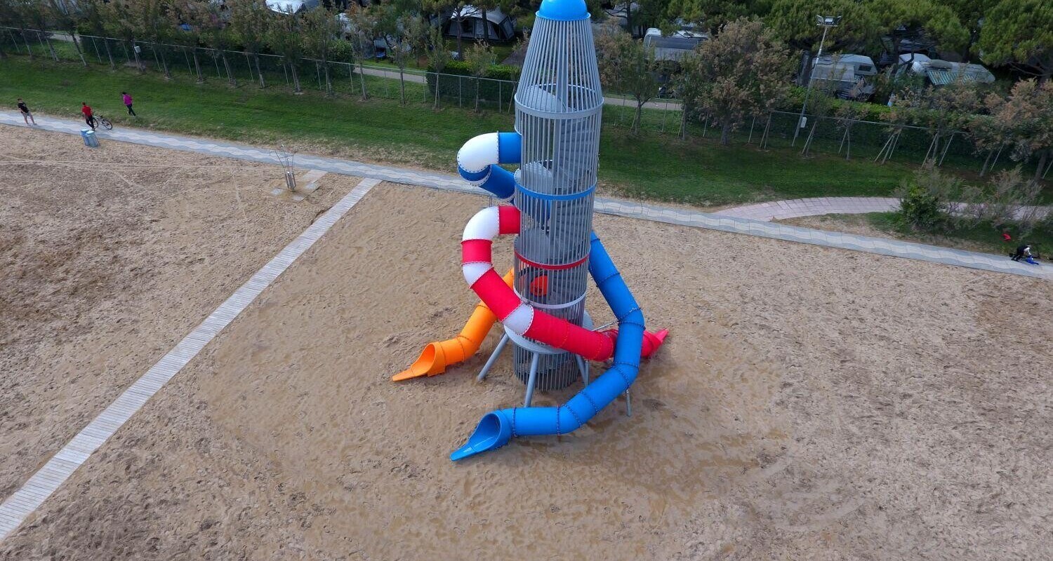 Una torre in alluminio, alta 12 metri, attira l’attenzione di bambini e adulti sulla spiaggia di Jesolo (Venezia). La struttura, che ricorda la forma di un razzo, è stata realizzata per il nostro cliente “Jesolo International Club Camping” ed è perfetta non solo per la spiaggia, ma anche per le grandi aree urbane e metropolitane, dato che non occupa molto spazio! Questa torre si risale attraverso una scala interna molto sicura e i 3 scivoli a tunnel in polietilene, posizionati a diverse altezze, offrono un divertimento impagabile.