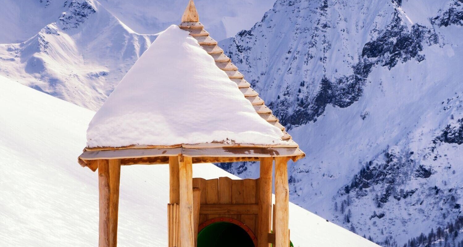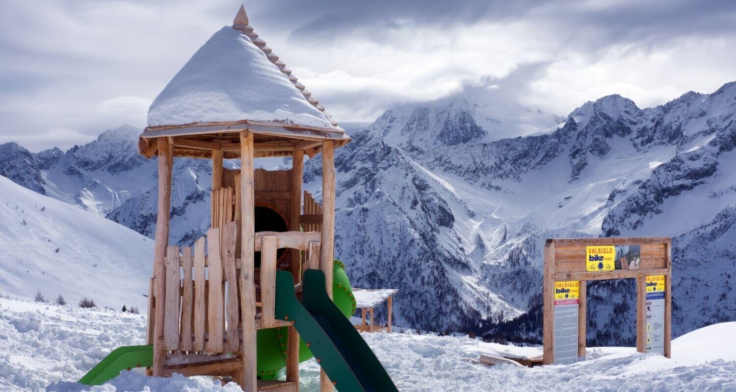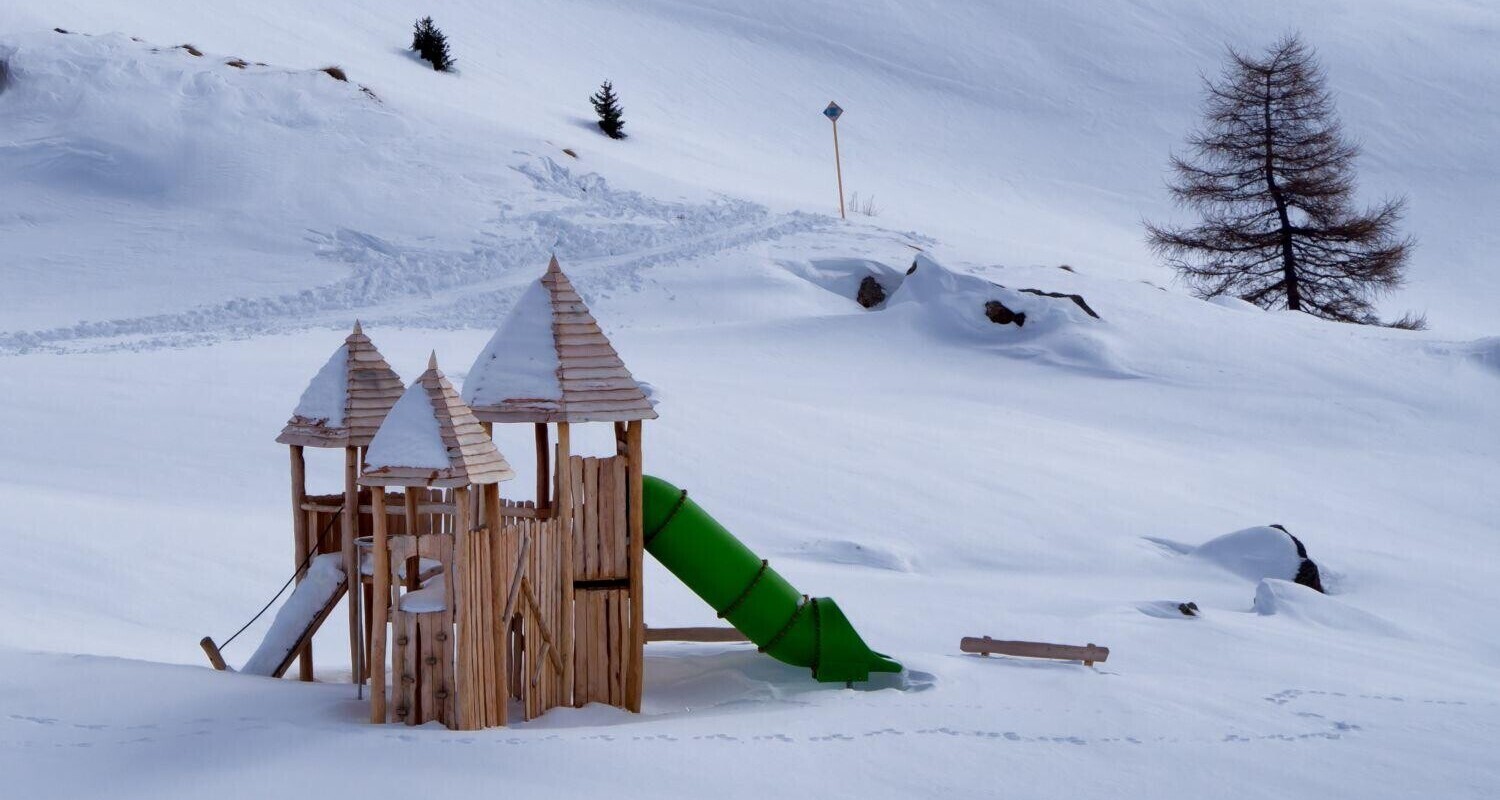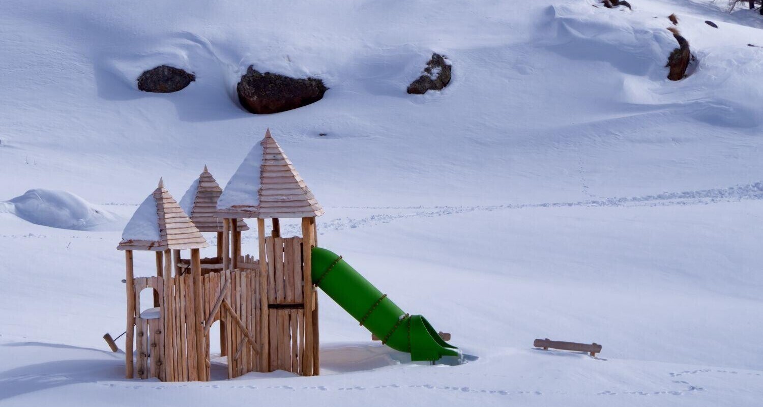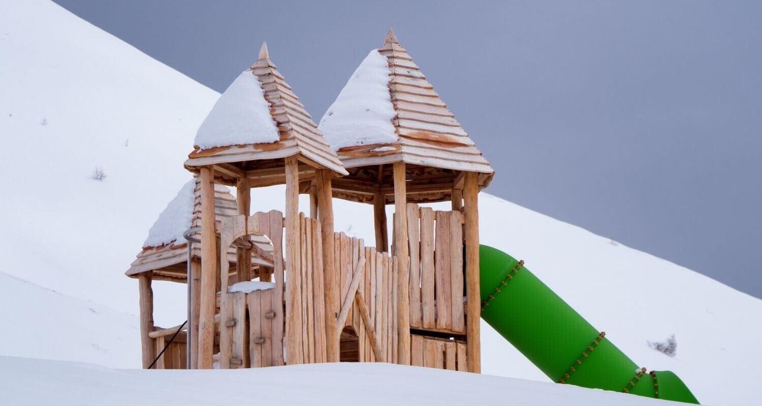 Il parco giochi in robinia, ricoperto di neve, è gettonatissimo anche in inverno!